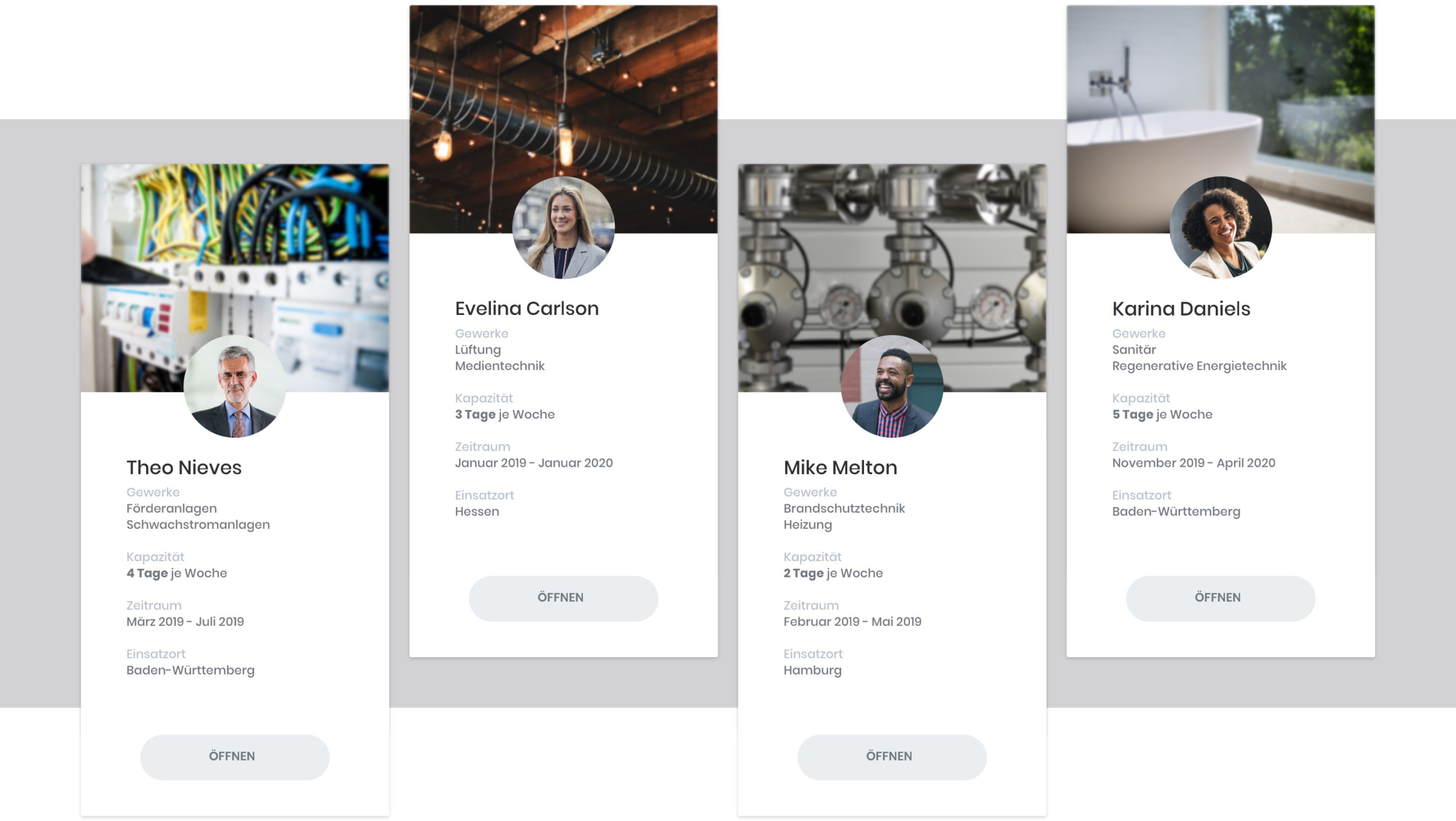Auf der PLABA Plattform können Spezialisten ganz einfach ein Profil erstellen und ihre Dienste anbieten. Neben der Expertise werden die freien Kapazitäten samt Zeitraum sowie der Einsatzort angegeben, welche dann direkt mit Projekt-Inseraten abgeglichen werden können. Dies wird unterstützt von einem hochmodernen Matching-System, welches Auftragnehmer und –geber auf Konpfdruck verbindet.