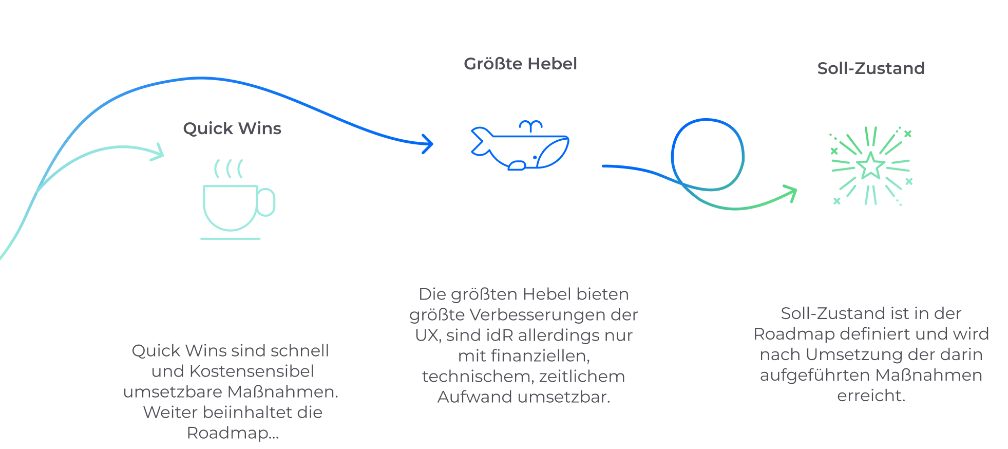 Diese enthalten Quick Wins – geringfügige Anpassungen mit hohen positiven Effekten – und Großer Hebel, die mit mehr Aufwänden verbunden sind, haben aber einen weit größeren Einfluss auf das Nutzererlebnis.