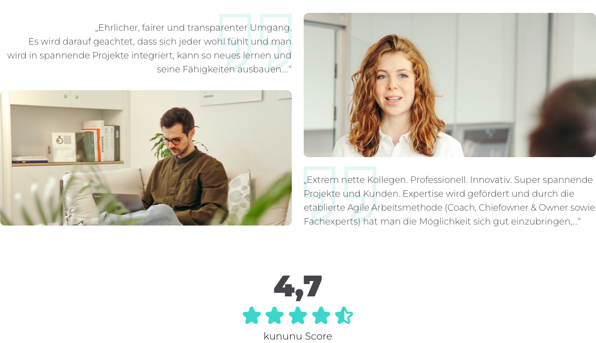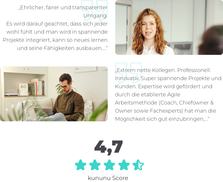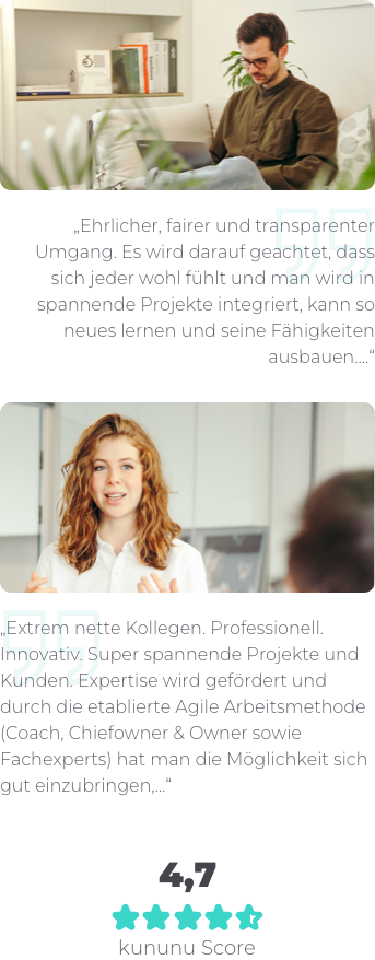 Wir sind stets auf der Suche nach neuen Expert:innen die Lust haben, spannende digitale Produkte und Services zu kreieren und dabei stets die Nutzer:innen und unsere Kund:innen im Auge behalten. Du findest bei uns ein zukunftsorientiertes, anspruchsvolles und abwechslungsreiches Aufgabengebiet, das du jeden Tag aktiv mitgestaltest. Dafür bekommst du bei uns viel Vertrauen und mehr als nur eine Rolle in unserem Team.
