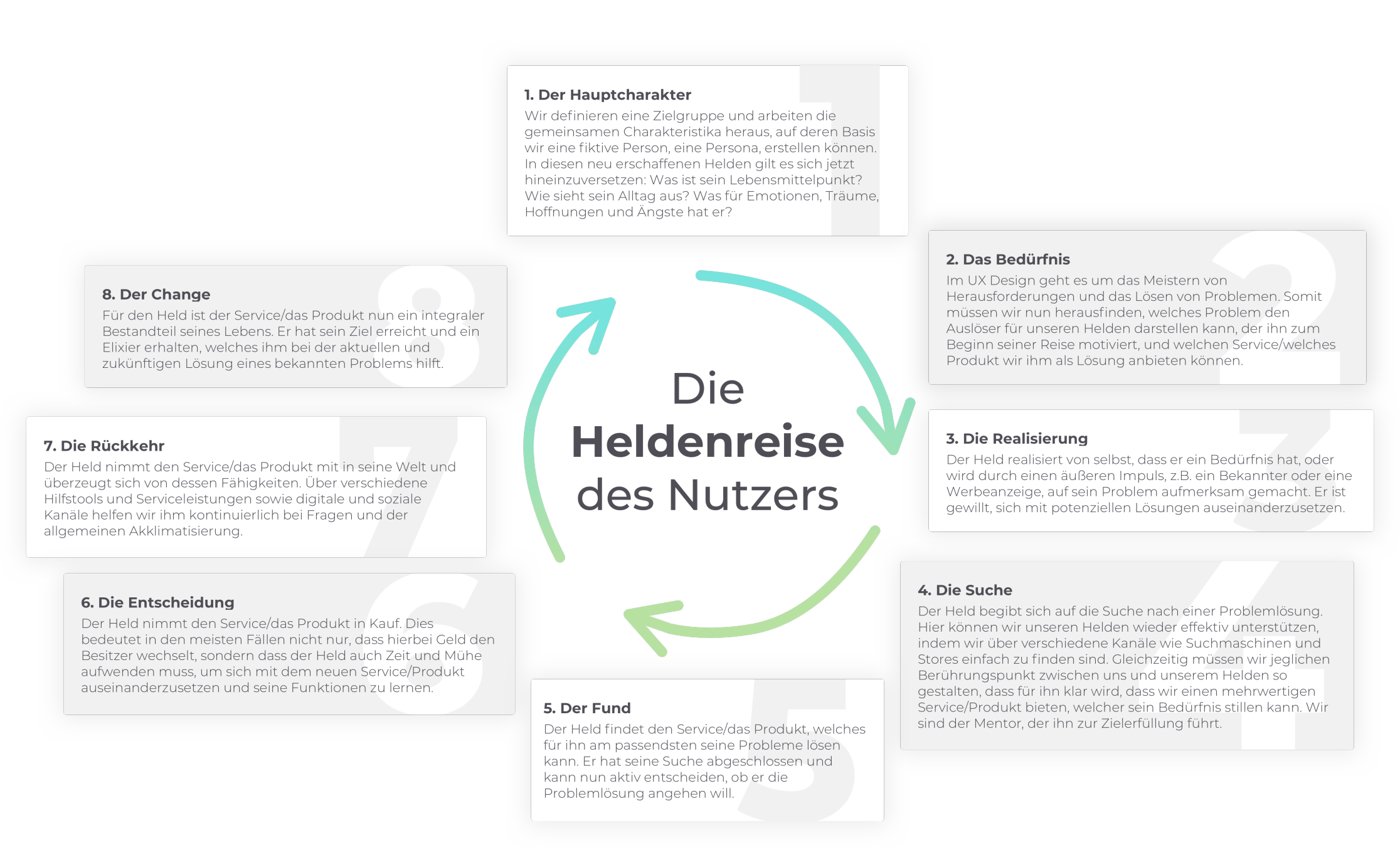 Die hier abgekürzte Version der Hero’s Journey, die von Dan Harmon in seinem ‘Story Circle’ vorgeschlagen wurde, zeigt, dass die Customer Journey viele Parallelen zur Heldenreise aufweist. Sie ist aber eher als ein Gedankenkonstrukt zu verstehen, welches abermals verdeutlichen soll, dass die Grundstruktur von Geschichten einen gemeinsamen Nenner hat und es an oberster Stelle steht, den Kontext und die Motivation des Helden/Nutzers zu verstehen.